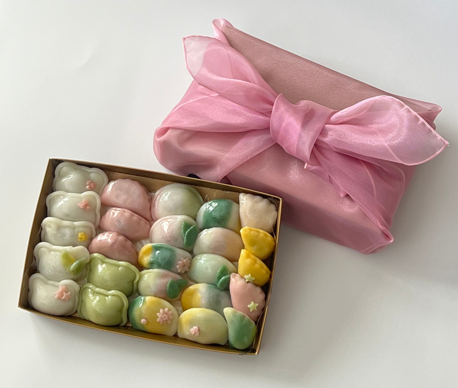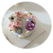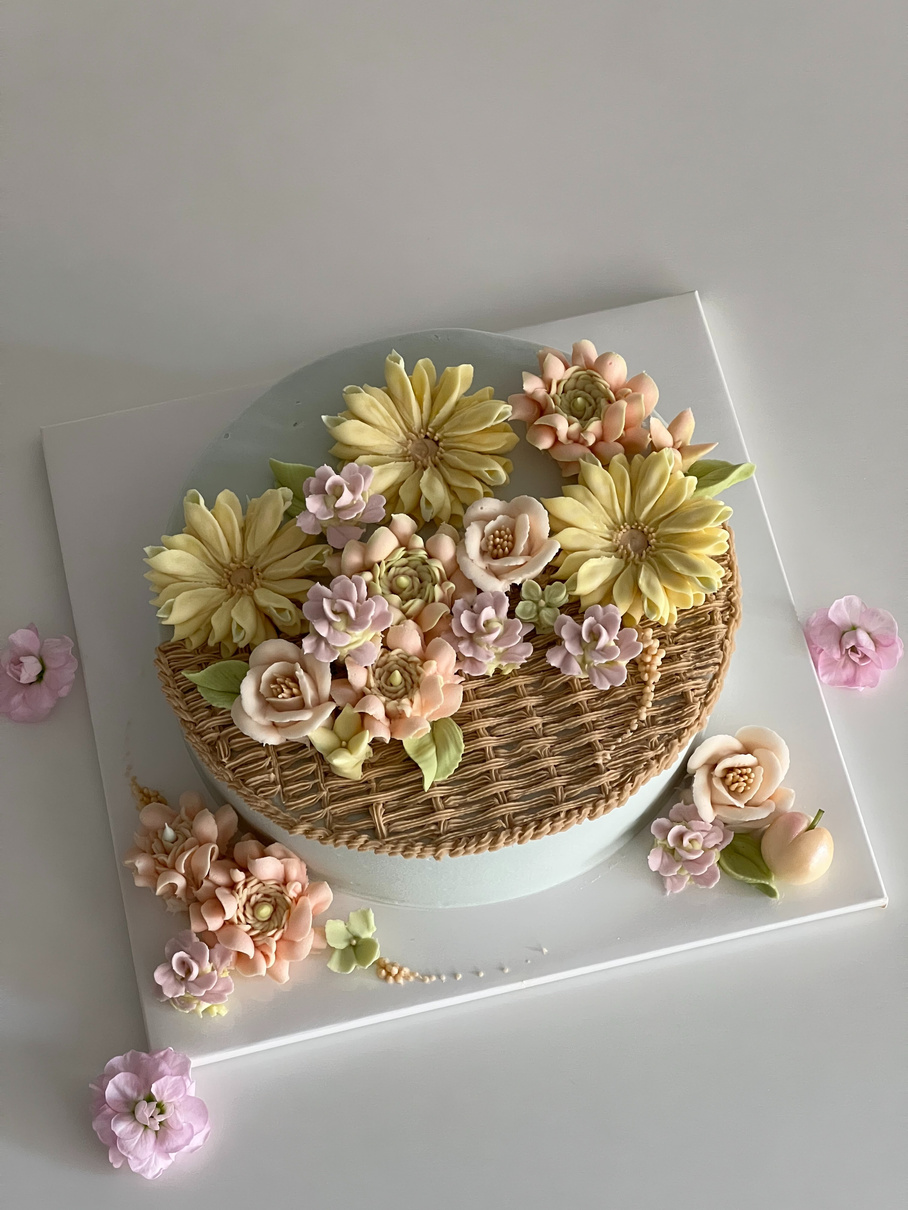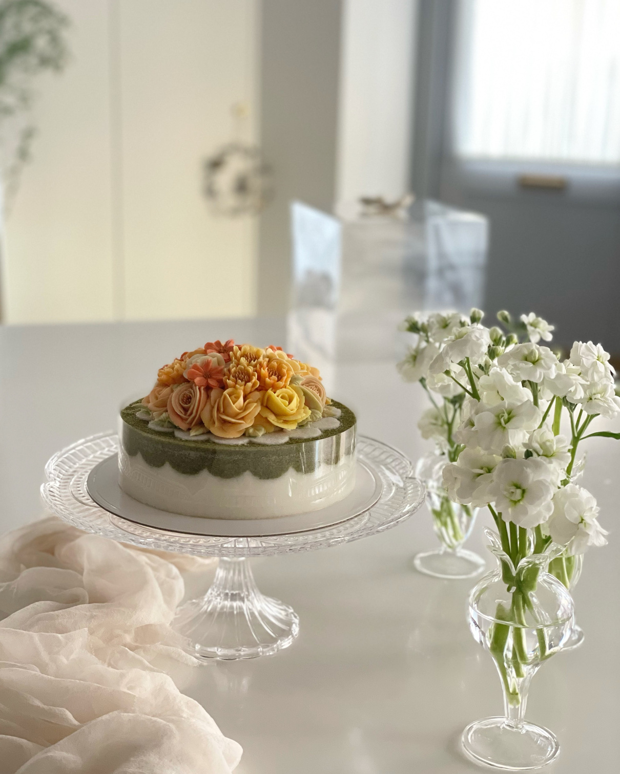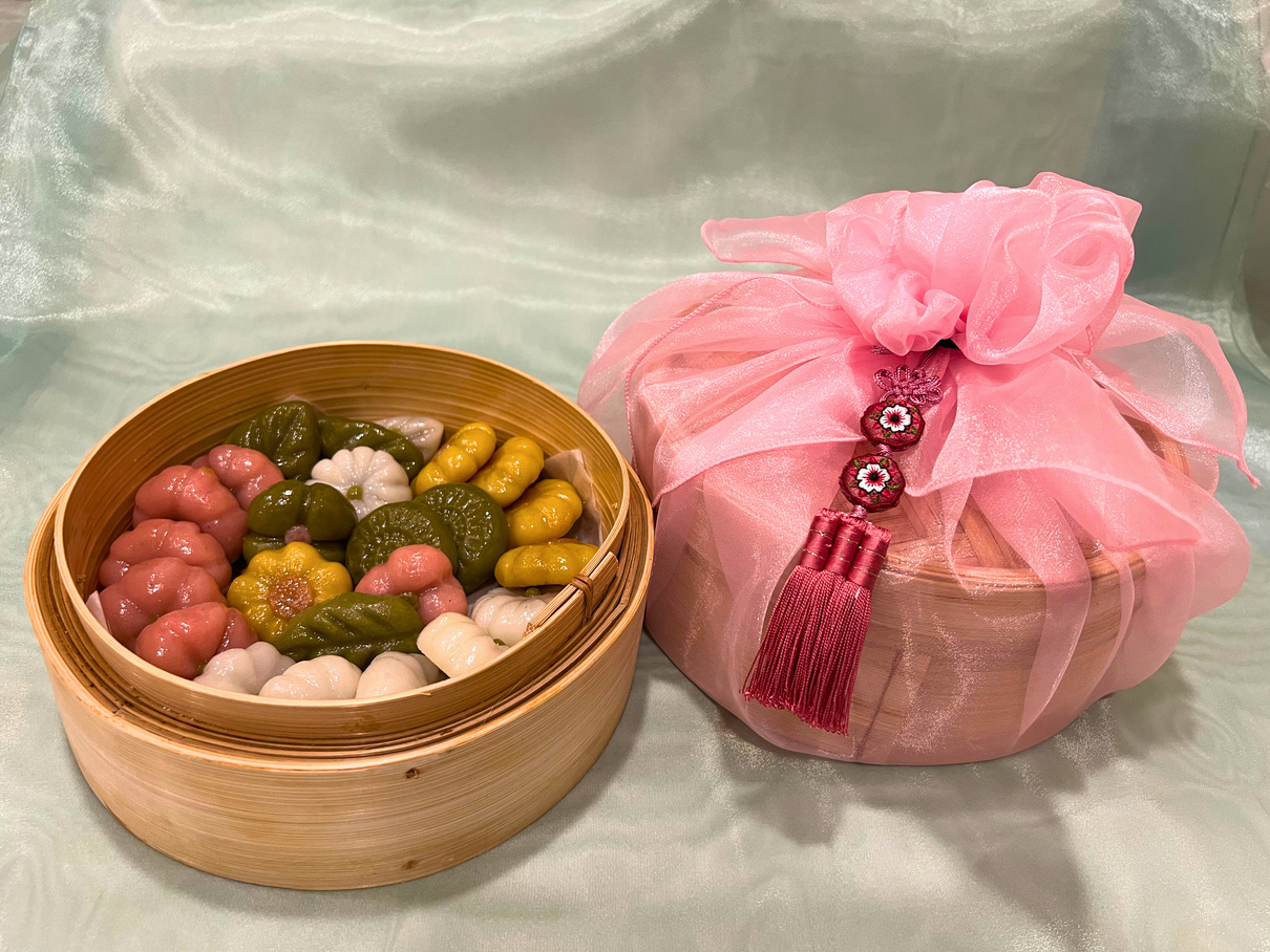 White Rice Cake is a sweet cake, but in rice cake form! It has a slightly more dry, crumbly texture than songpyeon, and more dense than a typical cake. We decorate it flowers made of frosting. Can come in either a typical cake size or cupcake size.